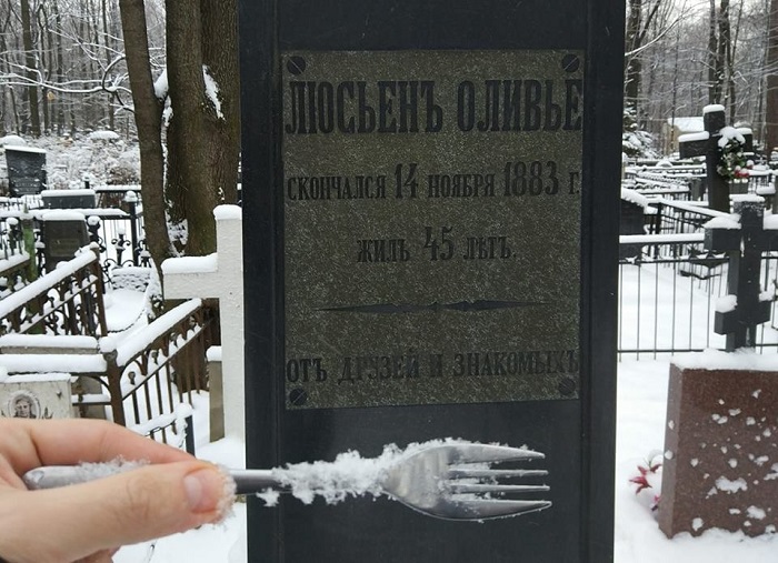 На могилу знаменитого кулинара Люсьена Оливье на Введенском кладбище начали приносить вилки в знак уважения к автору главного новогоднего салата России. Начало флешмобу положил Константин Максимюк – автор скандального клипа «Итоги года», который был снят на могиле Оливье (http://www.youtube.com/watch?v=xMhcraTYpOU).